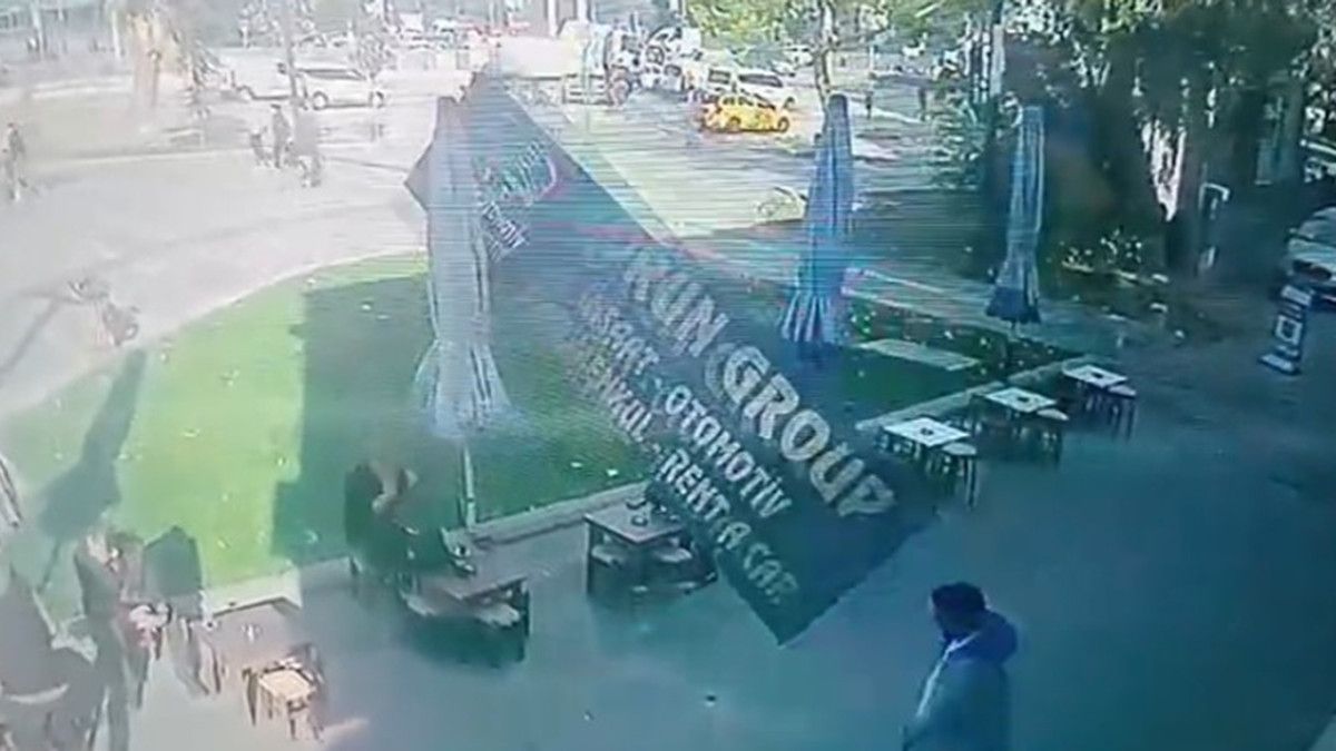 Bursa’da kafede oturan 2 kişinin rüzgarın etkisiyle yerinden koparak düşen tabelanın altında kalmaktan son anda kurtulduğu anlar güvenlik kamerasına yansıdı.