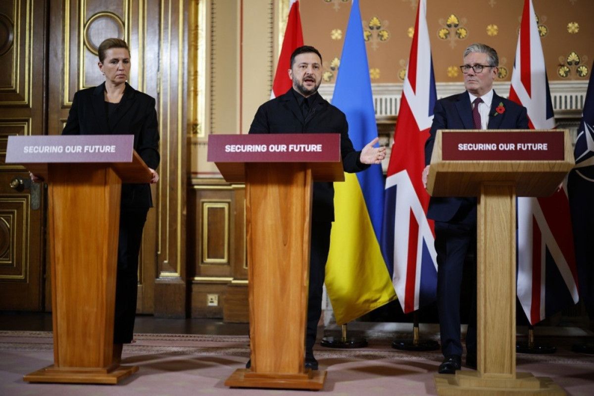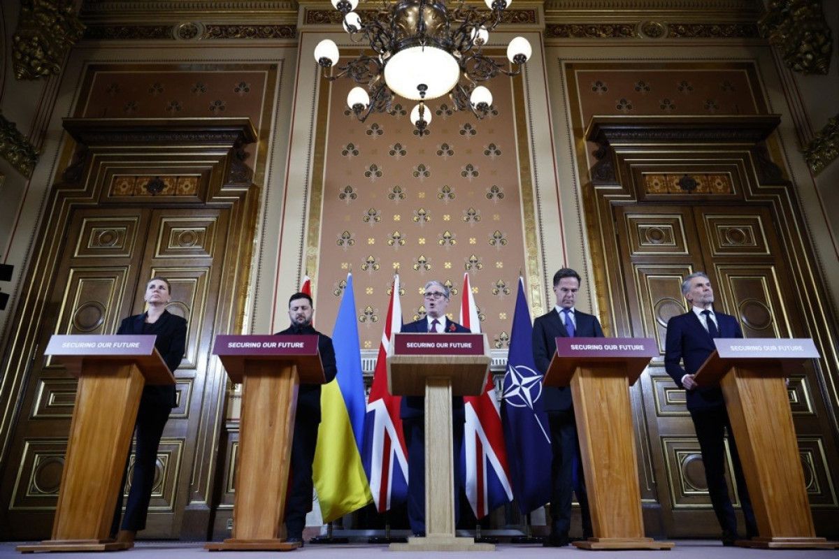 İngiltere Başbakanı Keir Starmer, Ukrayna Devlet Başkanı Vladimir Zelenskiy, Danimarka Başbakanı Mette Frederiksen, Hollanda Başbakanı Dick Schoof ve NATO Genel Sekreteri Mark Rutte, İngiltere’nin başkenti Londra’da gerçekleştirilen Gönüllüler Koalisyonu toplantısının ardından ortak basın toplantısı düzenledi.
