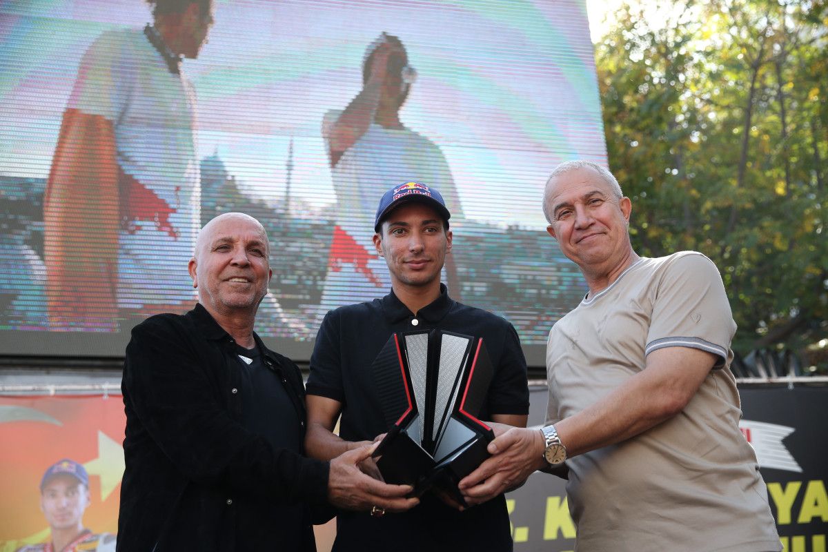 Şampiyonluğu ilan etmekten dolayı mutlu olduğunu söyleyen Dünya Şampiyonu Toprak Razgatlıoğlu “Öncelikle Belediye başkanıma ve Alanyaspor Başkanıma çok teşekkür ederim. Çok güzel konuşmalar yaptılar ve bu organizasyon içinde onlara da ayrıca teşekkür ediyorum. Ve sizler tabi ki de benim için çok değerlisiniz. Çünkü biliyorsunuz dünya şampiyonu olduğunuzda ben her zaman biz diyorum çünkü hep beraber bu dünya şampiyonluğunu elde ettik. Çünkü sizlerin yorumları ve bize olan sevginiz gerçekten bizleri çok güçlendiriyor. Biliyorsunuz çok zorlu bir sene geçirdik. Özellikle son yarışımız çok stresliydi. Rakibimiz tarafından yarış dışı kalmıştık. Son yarışta her şey bitti. O stres altında gerçekten yönetmek biraz zordu. Ama bir şekilde şampiyonluğu tekrar ilan ettik” dedi.