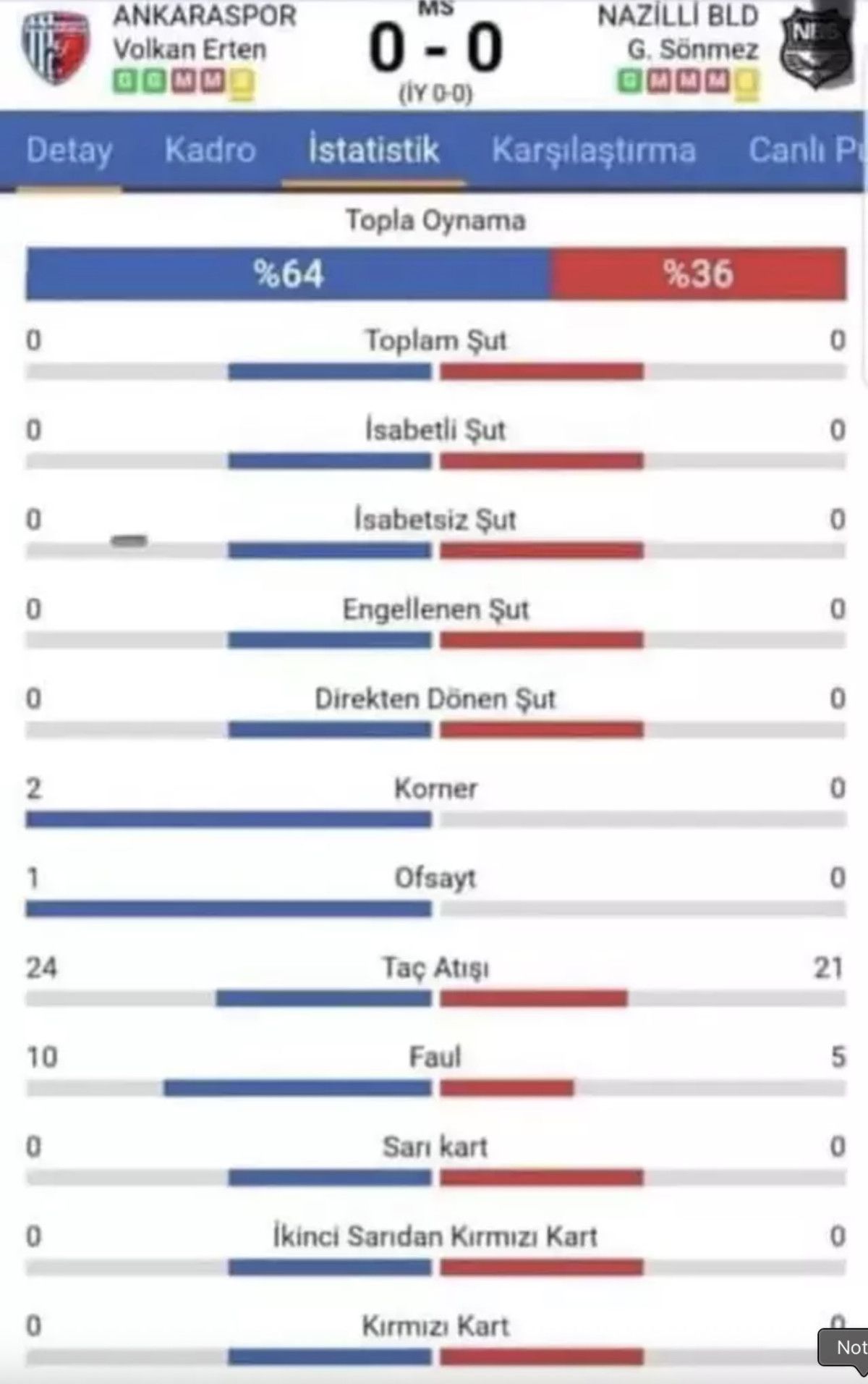 Ayrıca karşılaşmada Ankaraspor 10 faul, Nazilli Belediyespor ise 5 faul yapmış ve hakem kartına başvurmamıştı.