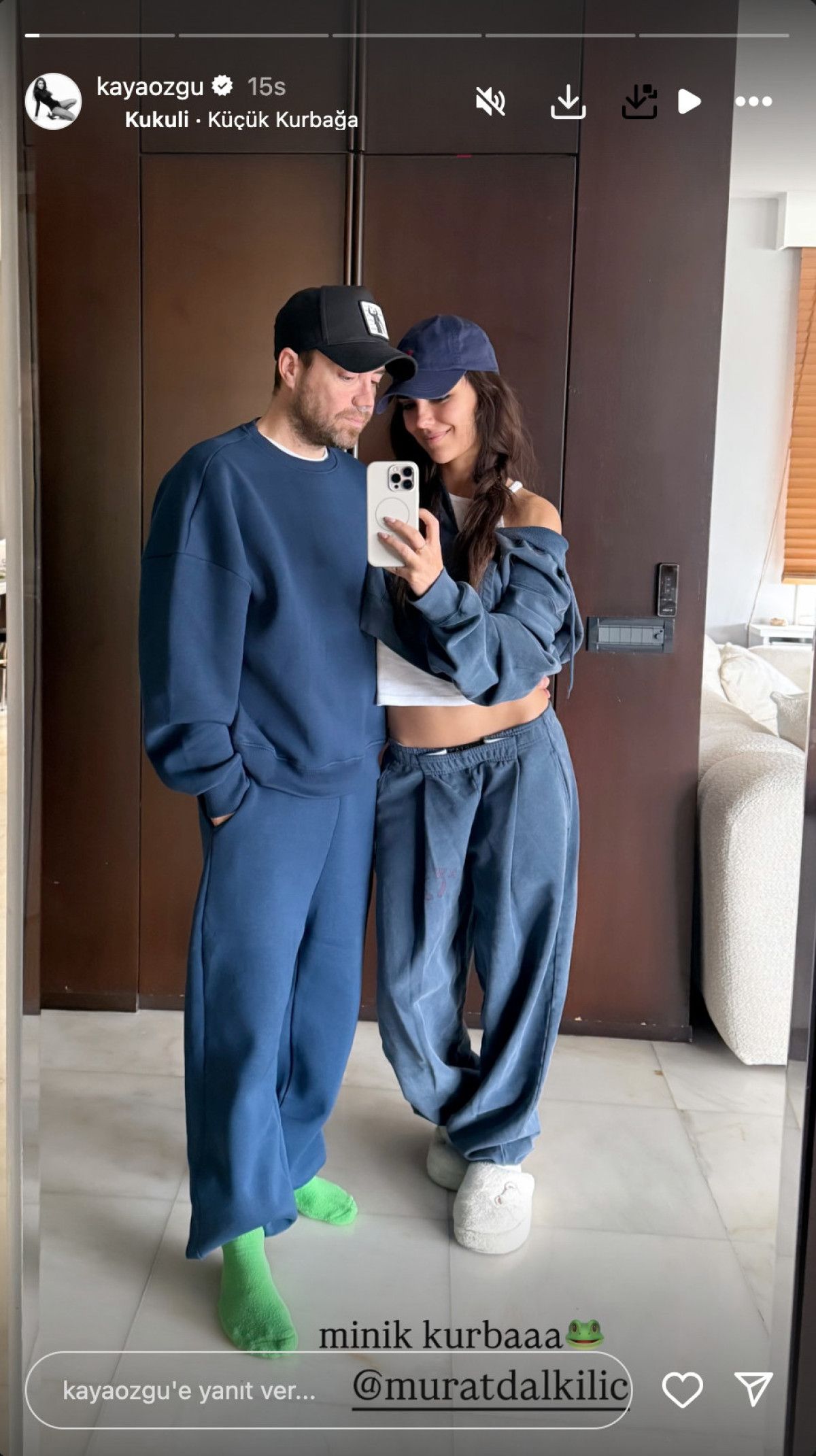 Dalkılıç ile ayna pozu veren 29 yaşındaki oyuncu paylaşımına, ‘Minik kurbağa’ yazdı ve arkaya da Küçük Kurbağa şarkısını koydu. Hal böyle olunca Özgü Kaya, sosyal medyanın diline düştü.