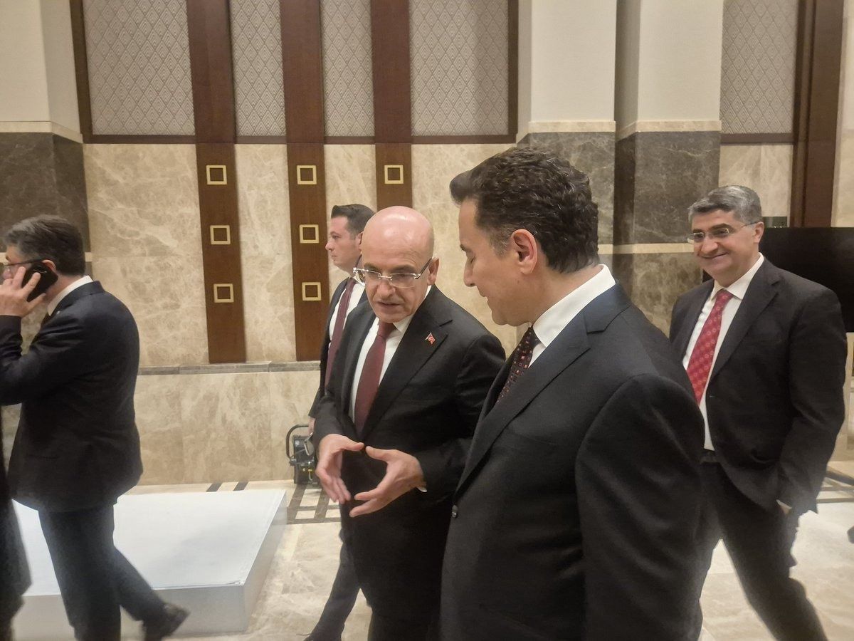 Birlikte görev aldıkları AK Parti hükümetlerinde uzun yıllar ekonomiyi yöneten iki isim Ali Babacan ile Hazine ve Maliye Mehmet Şimşek, resepsiyonda bir araya geldi.