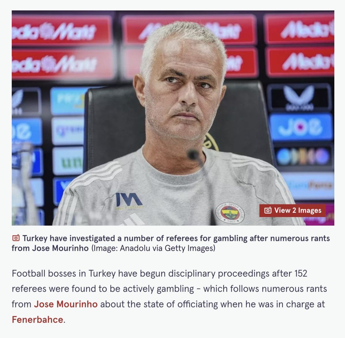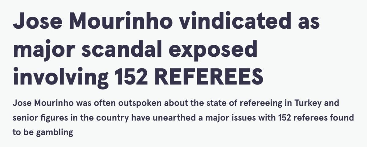 “Türkiye’de futbolun patronları, Mourinho’nun Fenerbahçe’de görev yaptığı dönemde hakemliğin durumu hakkında yaptığı çok sayıda çıkışın ardından, 152 hakemin aktif olarak kumar oynadığının tespit edilmesiyle disiplin soruşturması başlattı. ‘Özel Birisi’, hakemlik standartlarını yüksek sesle eleştiren, önceden bilseydi işi reddedeceğini söyleyen biriydi ve şimdi ülkede yetkililer yıllar sonra büyük bir sorunu ortaya çıkardı.”