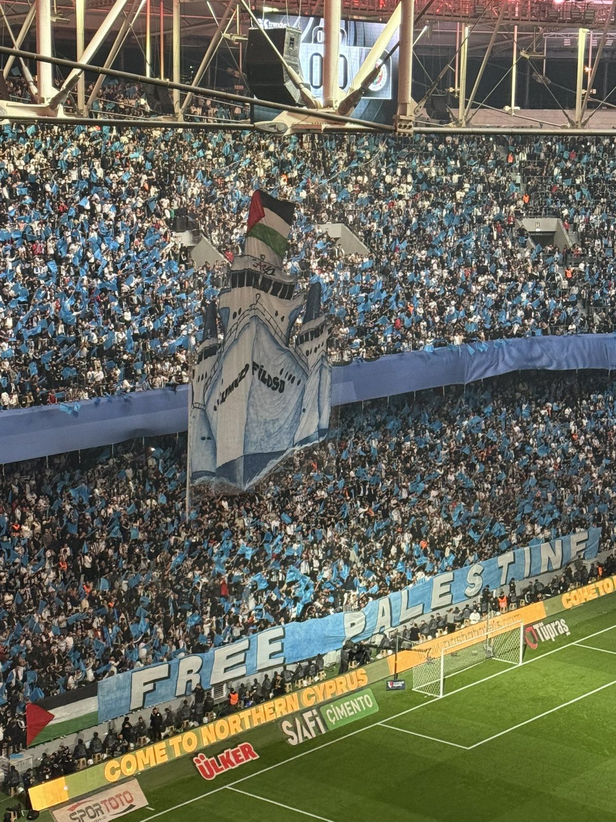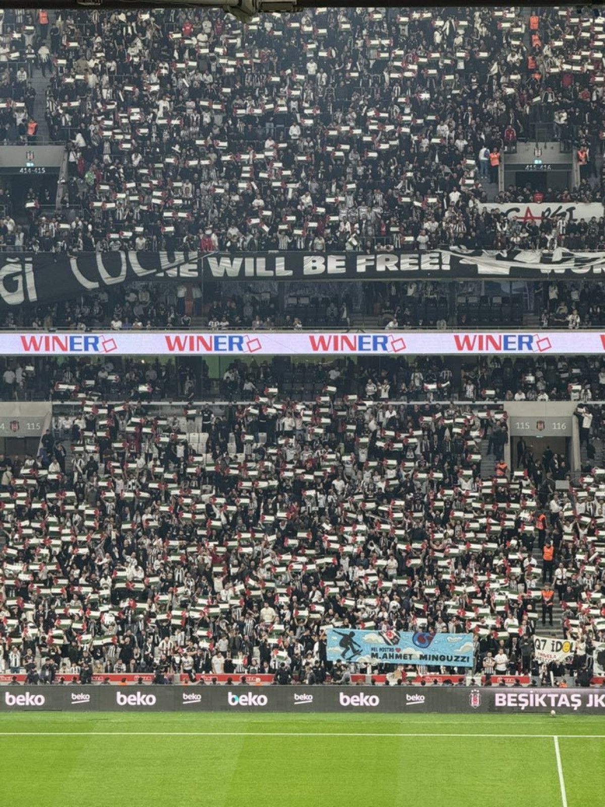 Siyah-beyazlı futbolseverler, “Özgür Filistin” koreografisi hazırladı. Beşiktaşlılar, ayrıca Filistin bayrakları açtı.
