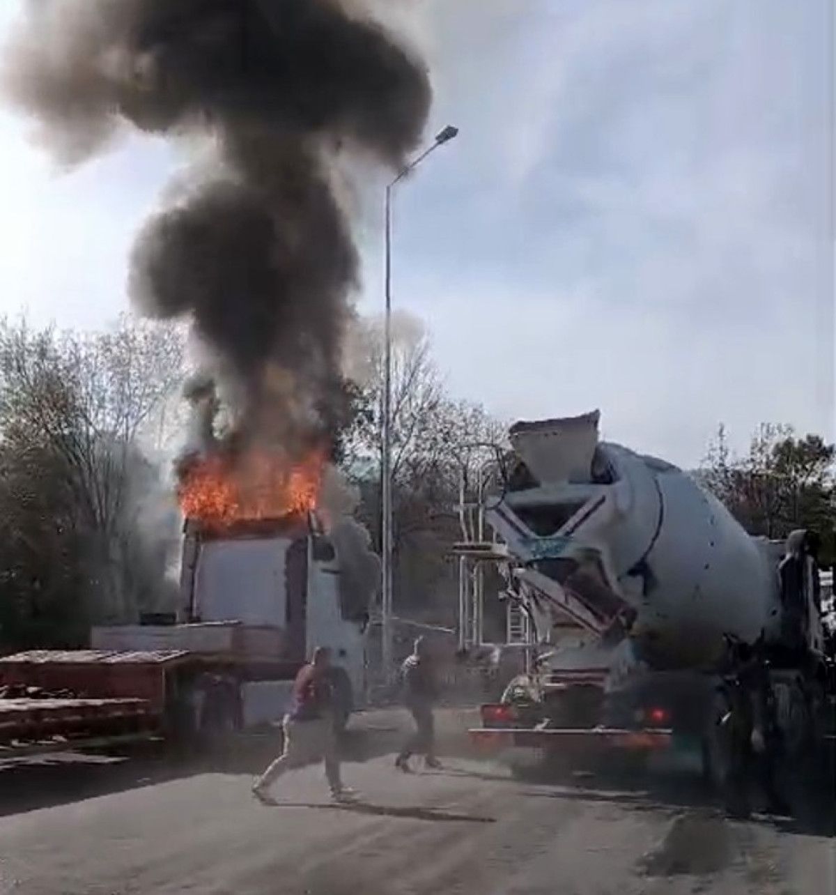 Bölgede beton çalışması yapan mikser sürücüleri, alevlerin bir anda yükseldiğini görünce aracın yanına gelerek söndürme çalışmalarına destek verdi.