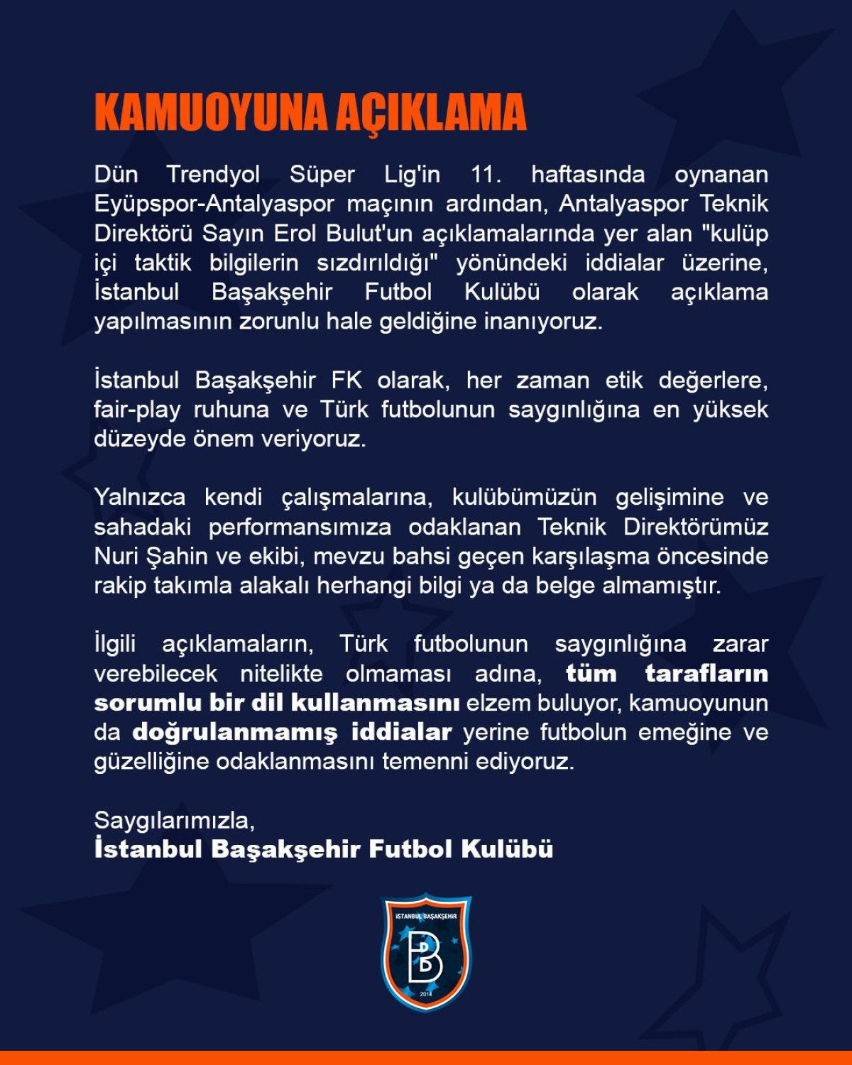 Dün Süper Lig’in 11. haftasında oynanan Eyüpspor-Antalyaspor maçının ardından, Antalyaspor Teknik Direktörü Sayın Erol Bulut’un açıklamalarında yer alan “kulüp içi taktik bilgilerin sızdırıldığı” yönündeki iddialar üzerine, İstanbul Başakşehir Futbol Kulübü olarak açıklama yapılmasının zorunlu hale geldiğine inanıyoruz. İstanbul Başakşehir FK olarak, her zaman etik değerlere, fair-play ruhuna ve Türk futbolunun saygınlığına en yüksek düzeyde önem veriyoruz. Yalnızca kendi çalışmalarına, kulübümüzün gelişimine ve sahadaki performansımıza odaklanan Teknik Direktörümüz Nuri Şahin ve ekibi, mevzu bahsi geçen karşılaşma öncesinde rakip takımla alakalı herhangi bilgi ya da belge almamıştır. İlgili açıklamaların, Türk futbolunun saygınlığına zarar verebilecek nitelikte olmaması adına, tüm tarafların sorumlu bir dil kullanmasını elzem buluyor, kamuoyunun da doğrulanmamış iddialar yerine futbolun emeğine ve güzelliğine odaklanmasını temenni ediyoruz.