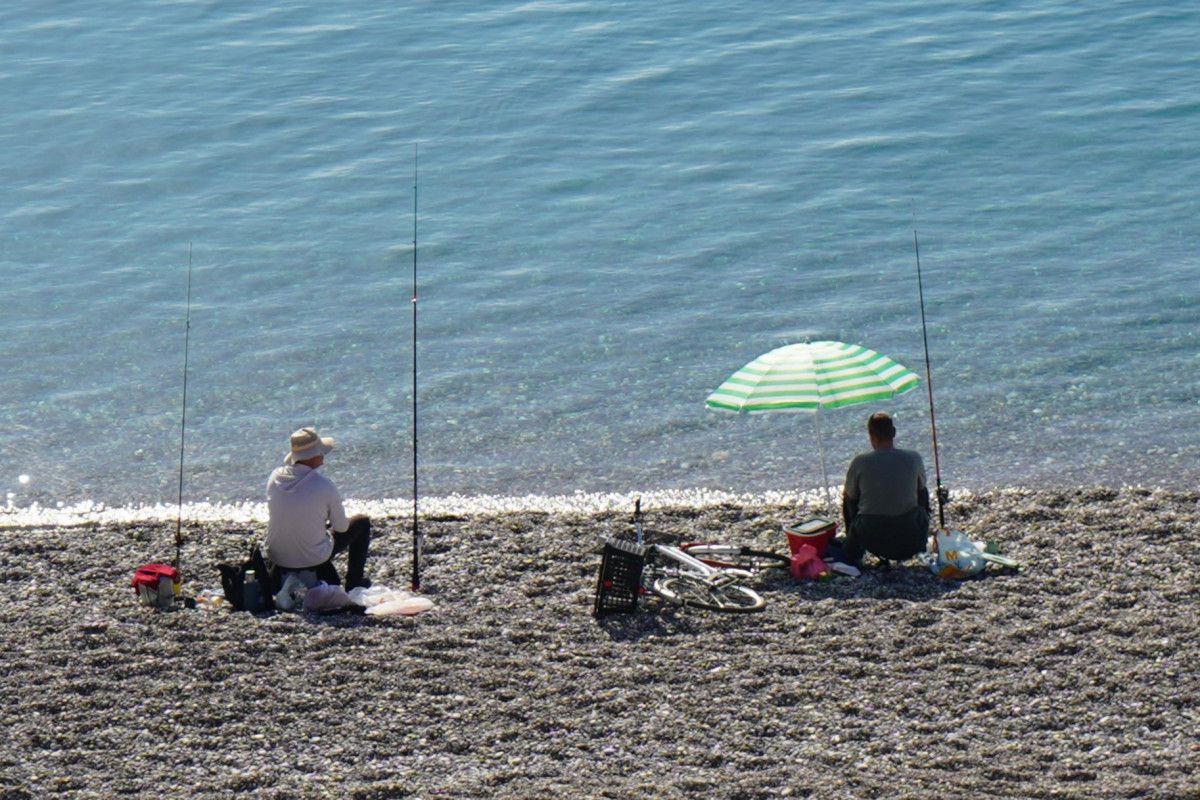 Yerli ve yabancı turistlerden bazıları sahilde spor yaparken bazıları ise balık tutarak güneşli havanın keyfini çıkardı.
