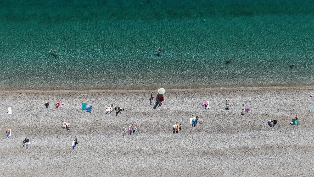 Sabah saatlerinden itibaren sahile gelen yerli ve yabancı turistler, güneşlenip Akdeniz’in ılık sularında yüzdü.