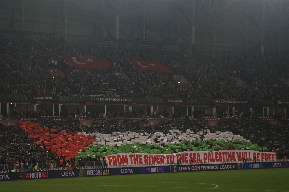 Kırmızı-beyazlı futbolseverler, “From the river to the sea, palestine will be free” (Nehirden denize kadar Filistin özgür olacak) yazılı pankart açtı.