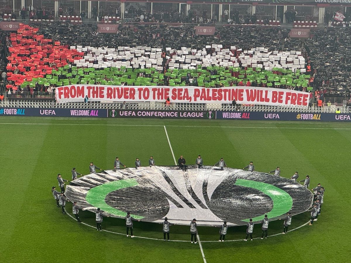 Kırmızı-beyazlı futbolseverler, “From the river to the sea, palestine will be free” (Nehirden denize kadar Filistin özgür olacak) yazılı pankart açtı.
