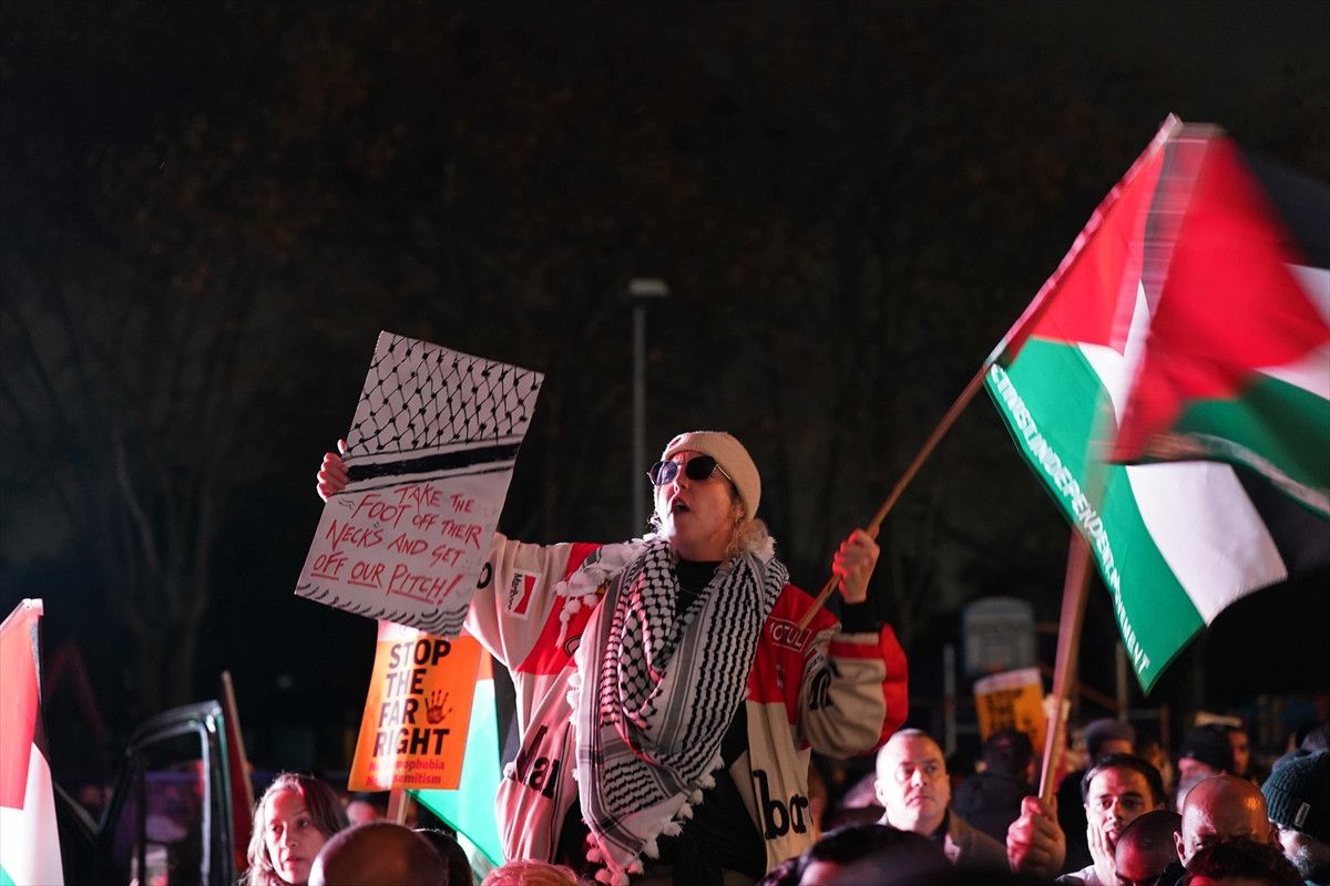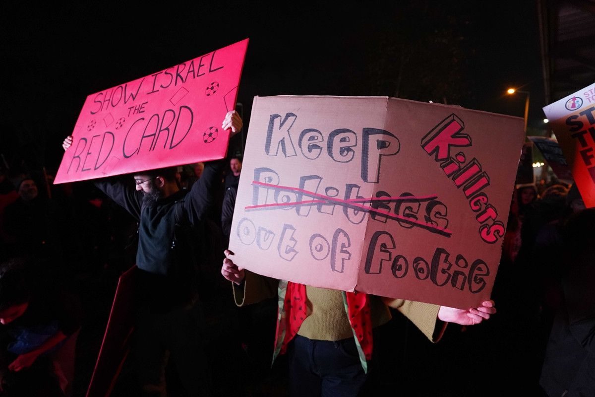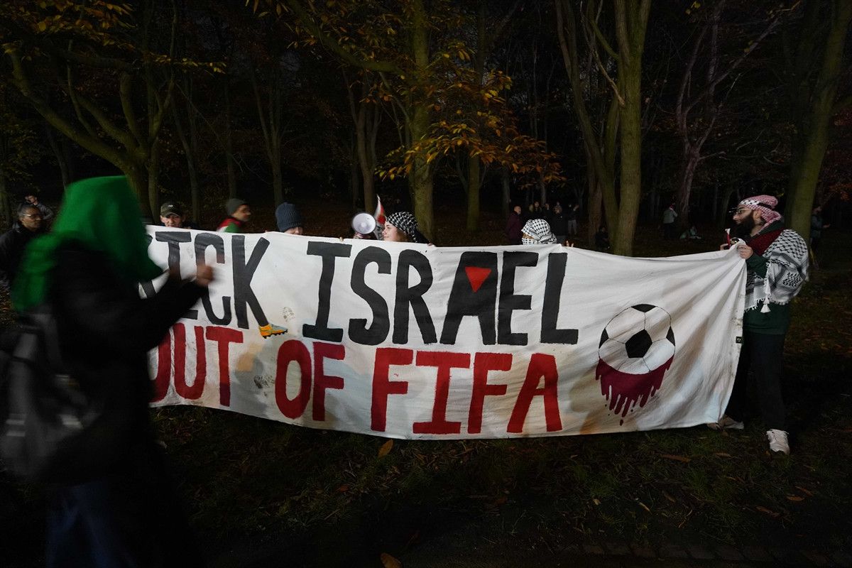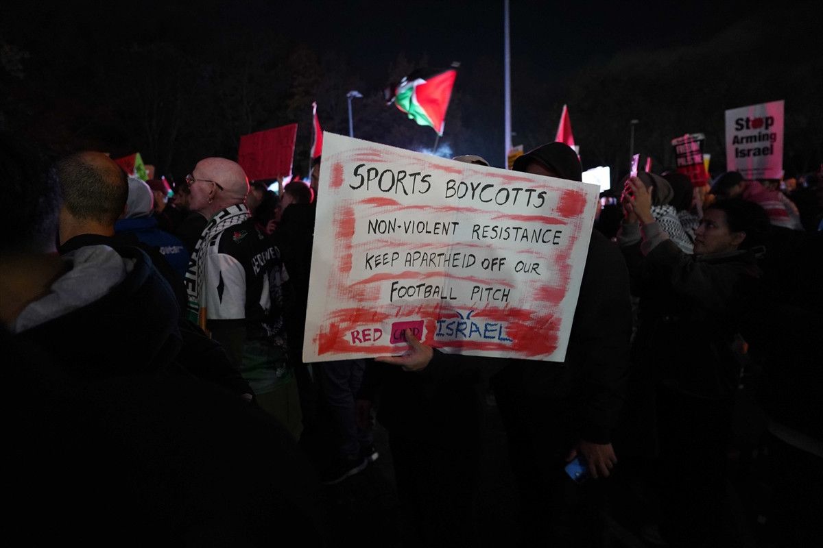 Sık sık “Özgür Filistin” sloganı atan ve stadın önüne dev Filistin bayrağı açan göstericiler, “İsrail’i silahlandırmayı durdurun”, “Gazze’yi aç bırakmayı durdurun”, “İsrail’i FIFA’dan atın”, “İsrail’e kırmızı kart” ve “Soykırımı durdurun” yazılı pankartlar taşıdı.