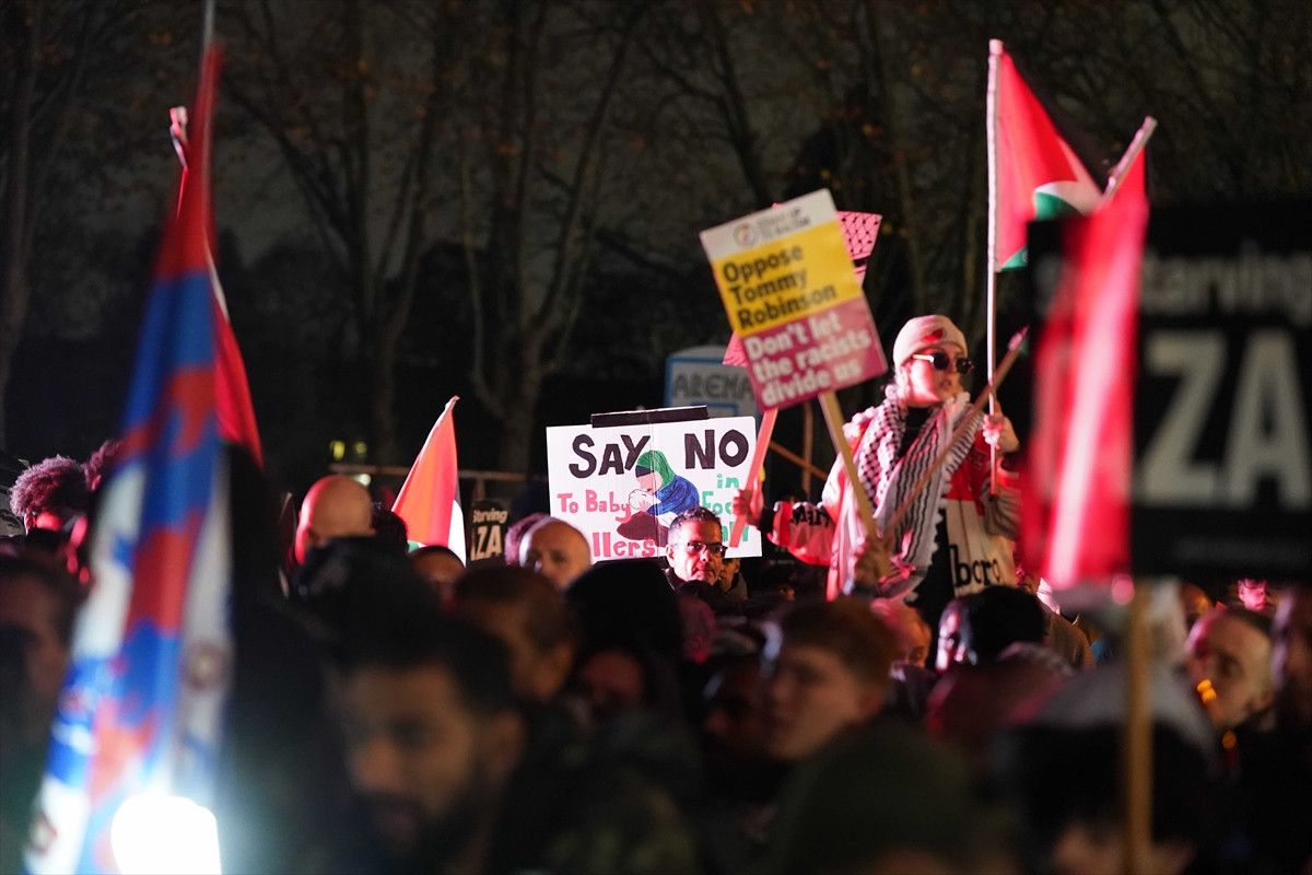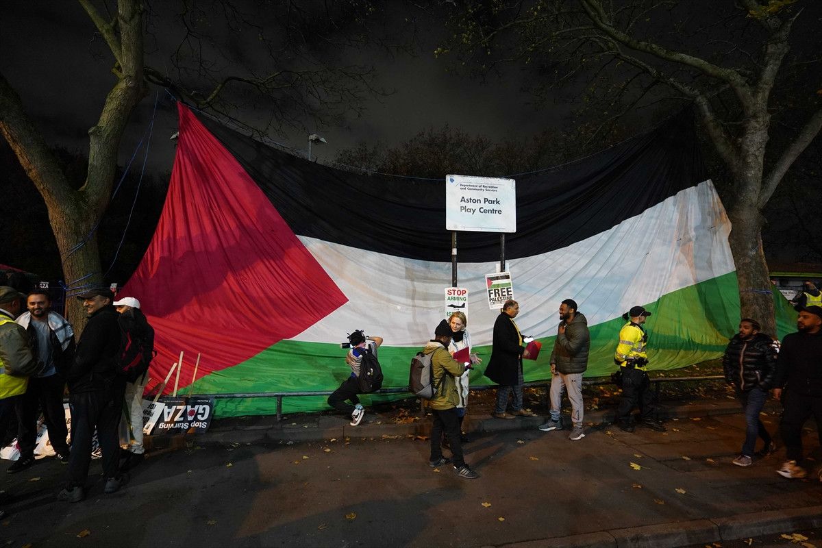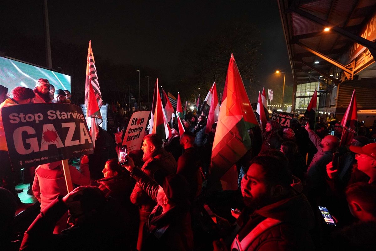 Filistin Dayanışma Kampanyası, Savaşı Durdur Koalisyonu, Britanya Müslümanlar Derneği, Al-Aqsa Dostları, Keşmir Dayanışma Kampanyası ve Britanya’daki Filistin Forumu tarafından düzenlenen protestoya katılanlar Villa Park Stadı’nın önünde toplandı.
