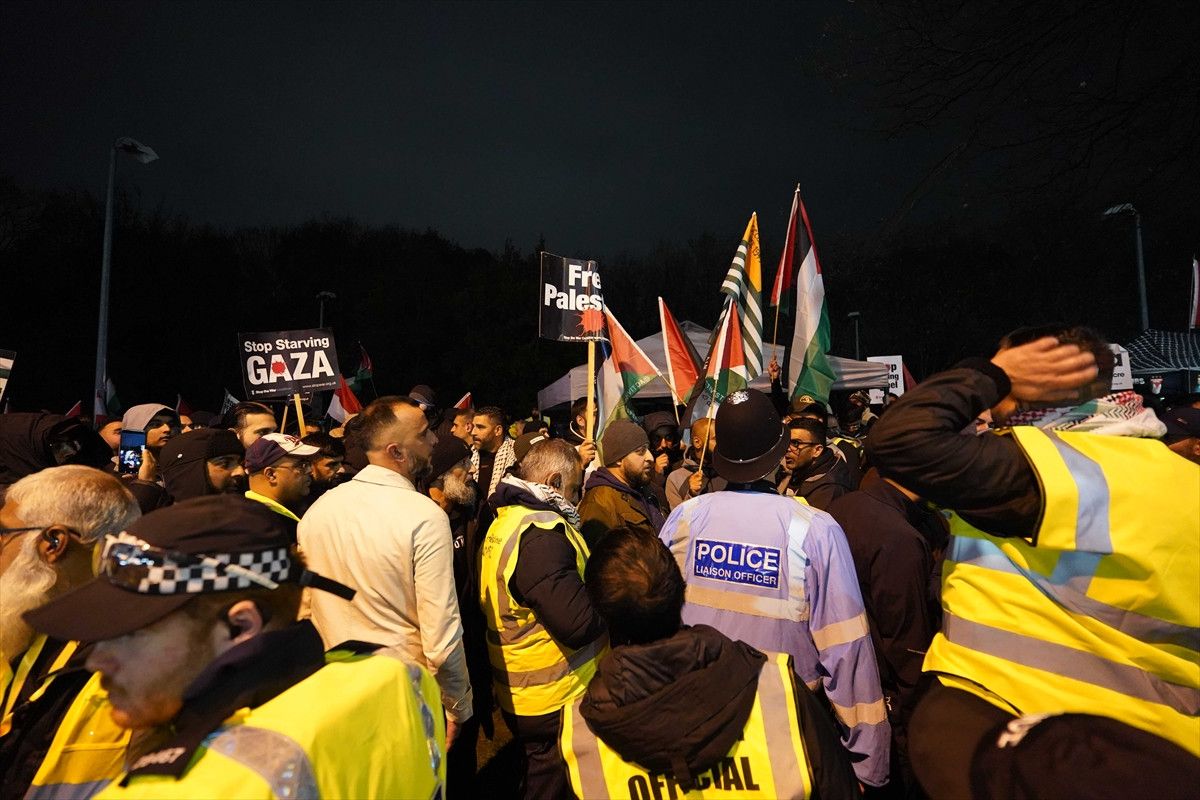 Filistin Dayanışma Kampanyası, Savaşı Durdur Koalisyonu, Britanya Müslümanlar Derneği, Al-Aqsa Dostları, Keşmir Dayanışma Kampanyası ve Britanya’daki Filistin Forumu tarafından düzenlenen protestoya katılanlar Villa Park Stadı’nın önünde toplandı.