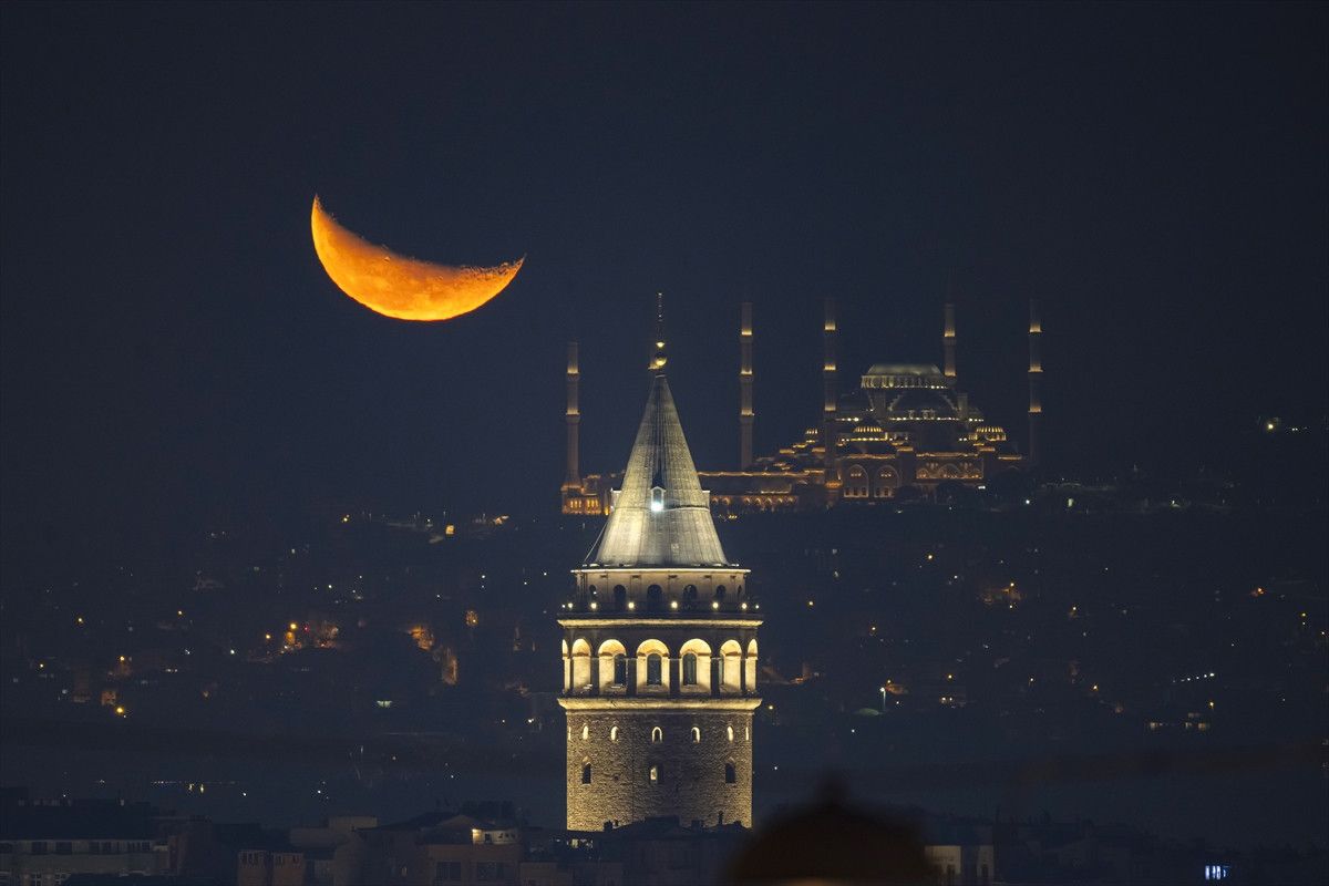 İstanbul’da akşam saatlerinde gökyüzünde beliren hilal, Galata Kulesi ile aynı karede görüntülendi.