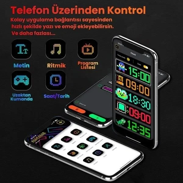 -Kolay uygulama kontrolü: LED ekranı uygulama aracılığıyla bağlayın, kendi ihtiyaçlarınıza ve sahnelerinize göre yazı, desen, animasyon tasarlayabilir ve ayrıca ihtiyaçlarınızı mükemmel şekilde karşılamak için parlaklığı ve hızı ayarlayabilirsiniz.
