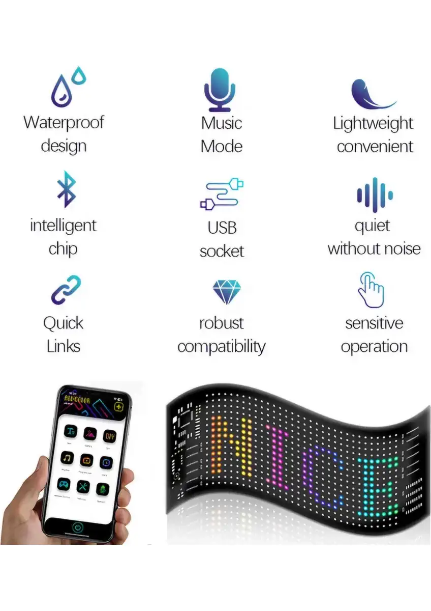 -Esnek, hafif ve güçlü: LED ekran ince ve hafiftir ve isteğe göre bükülebilir ve katlanabilir, usb tasarımı ile daha taşınabilirdir ve daha geniş bir kullanım yelpazesine sahiptir. Ürüne, ayrıca duvara veya istediğiniz diğer nesnelere takılabilen 3m bant da dahildir.